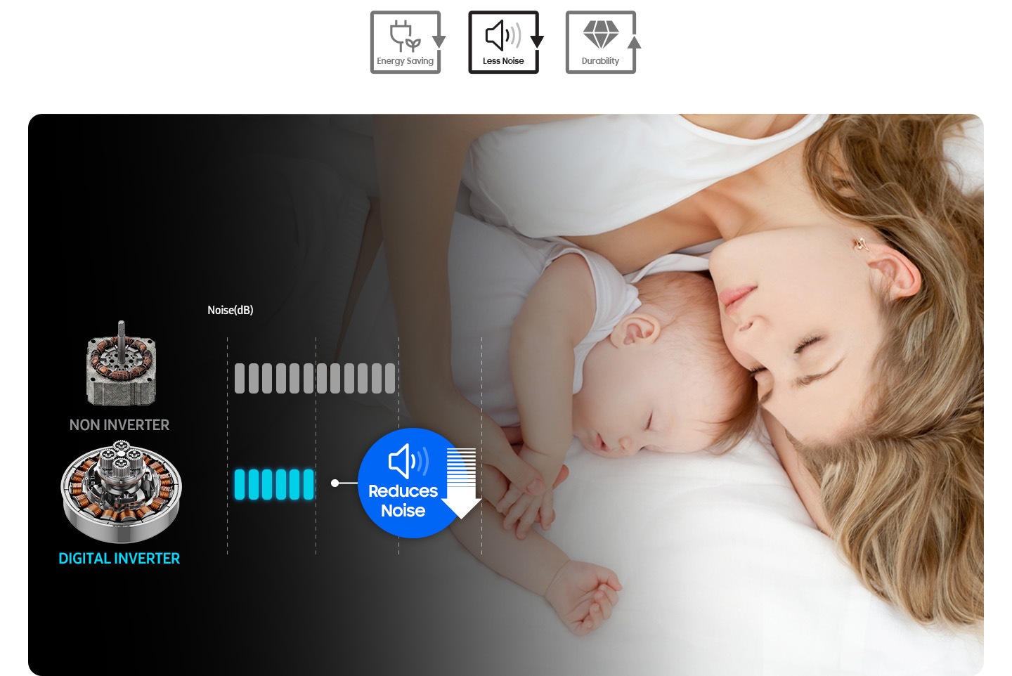 Enjoy efficiency and long-lasting performance with Digital Inverter Technology. It utilizes strong magnets for a quiet and powerful performance with enhanced energy efficiency. It also provides exceptional durability, backed-up by the industry's longest* warranty of 20 years on the motor.